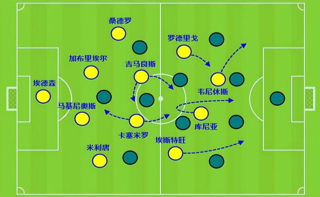 尤其是韦尼休斯作为箭头可以随时拉到左边路,这样一来带前腰属性的前锋(无论是库尼亚还是佩德罗)都能回到反插中路,罗德里戈也能跟进。埃斯特旺内收时那几步的动作频率很快,双足能处理球优势大。