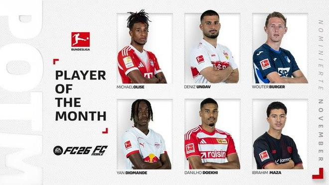 北京时间12月3日,德甲11月最佳球员候选名单公布,这6名球员为奥利塞、昂达夫、布格尔、扬-迪奥曼德、多克希、马扎。